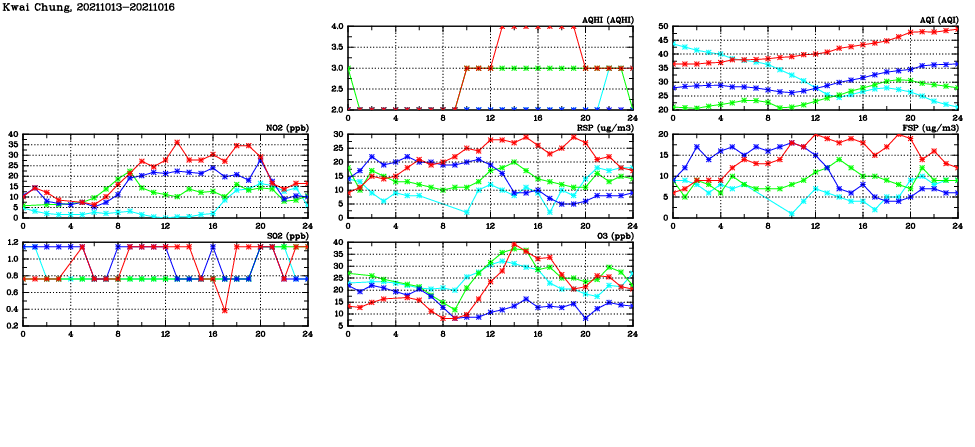 | Air Quality Data Time Series in Kwai Chung (2021/10/16) | ( Line colors: Day -3 Day -2 Day -1 Current day ) | 2D Map Current AQHI |