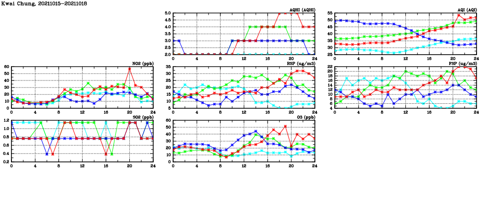 | Air Quality Data Time Series in Kwai Chung (2021/10/18) | ( Line colors: Day -3 Day -2 Day -1 Current day ) | 2D Map Current AQHI |