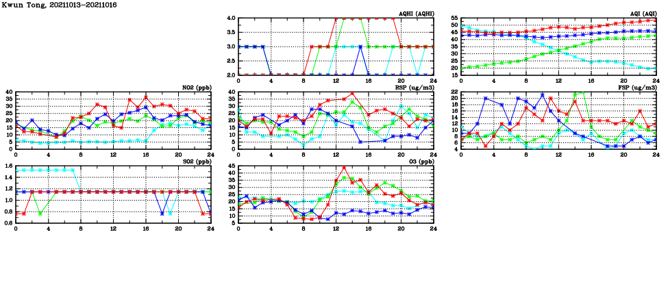 | Air Quality Data Time Series in Kwun Tong (2021/10/16) | ( Line colors: Day -3 Day -2 Day -1 Current day ) | 2D Map Current AQHI |