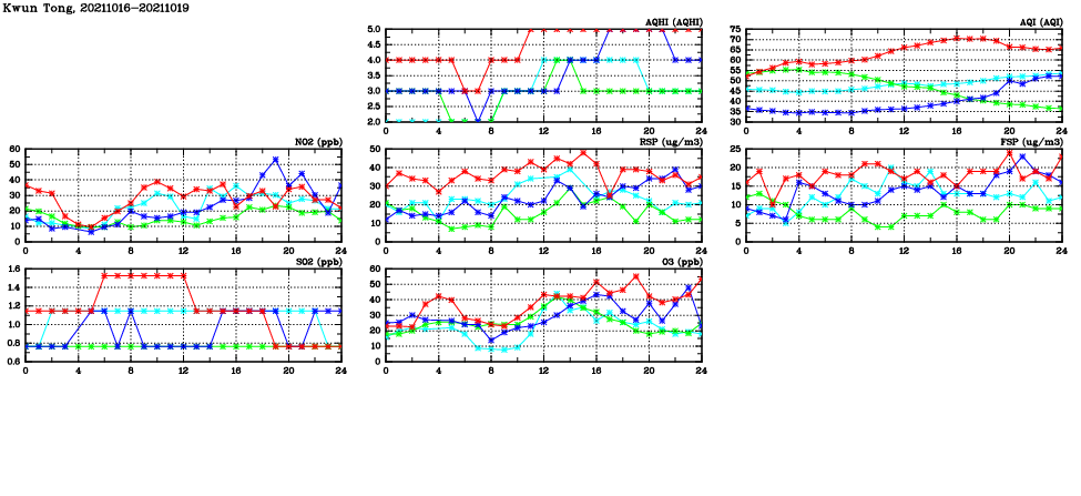 | Air Quality Data Time Series in Kwun Tong (2021/10/19) | ( Line colors: Day -3 Day -2 Day -1 Current day ) | 2D Map Current AQHI |