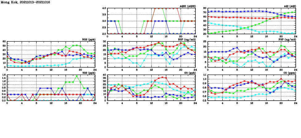| Air Quality Data Time Series in Mong Kok (2021/10/16) | ( Line colors: Day -3 Day -2 Day -1 Current day ) | 2D Map Current AQHI |