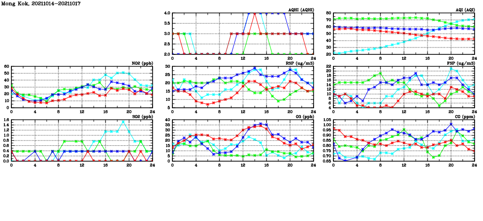 | Air Quality Data Time Series in Mong Kok (2021/10/17) | ( Line colors: Day -3 Day -2 Day -1 Current day ) | 2D Map Current AQHI |