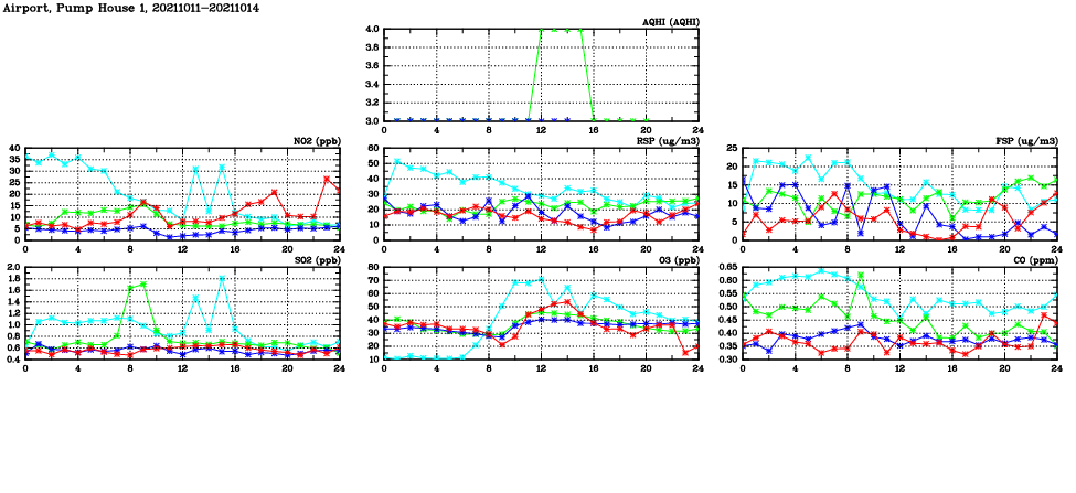 | Air Quality Data Time Series in Airport, Pump House 1 (2021/10/14) | ( Line colors: Day -3 Day -2 Day -1 Current day ) | 2D Map Current AQHI |
