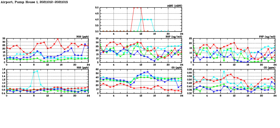 | Air Quality Data Time Series in Airport, Pump House 1 (2021/10/15) | ( Line colors: Day -3 Day -2 Day -1 Current day ) | 2D Map Current AQHI |