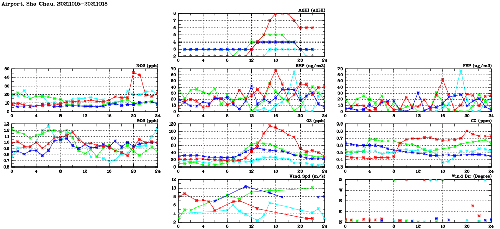 | Air Quality Data Time Series in Airport, Sha Chau (2021/10/18) | ( Line colors: Day -3 Day -2 Day -1 Current day ) | 2D Map Current AQHI |