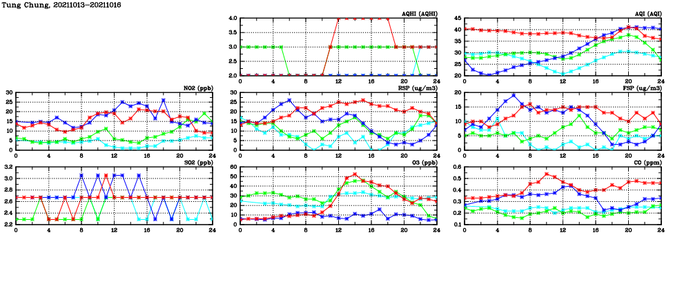 | Air Quality Data Time Series in Tung Chung (2021/10/16) | ( Line colors: Day -3 Day -2 Day -1 Current day ) | 2D Map Current AQHI |
