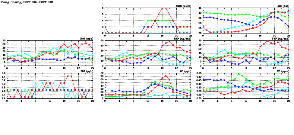 | Air Quality Data Time Series in Tung Chung (2021/10/18) | ( Line colors: Day -3 Day -2 Day -1 Current day ) | 2D Map Current AQHI |