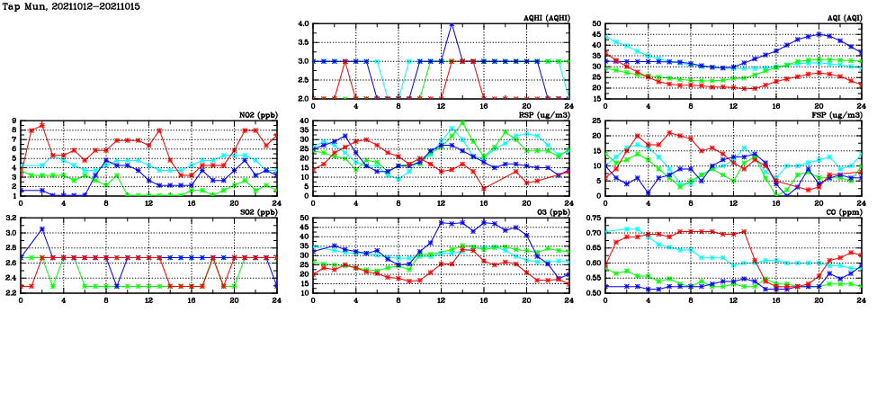 | Air Quality Data Time Series in Tap Mun (2021/10/15) | ( Line colors: Day -3 Day -2 Day -1 Current day ) | 2D Map Current AQHI |