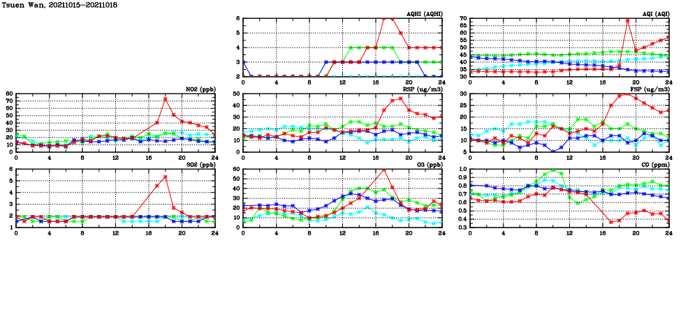 | Air Quality Data Time Series in Tsuen Wan (2021/10/18) | ( Line colors: Day -3 Day -2 Day -1 Current day ) | 2D Map Current AQHI |