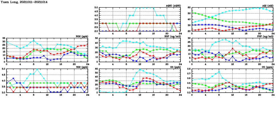 | Air Quality Data Time Series in Yuen Long (2021/10/14) | ( Line colors: Day -3 Day -2 Day -1 Current day ) | 2D Map Current AQHI |