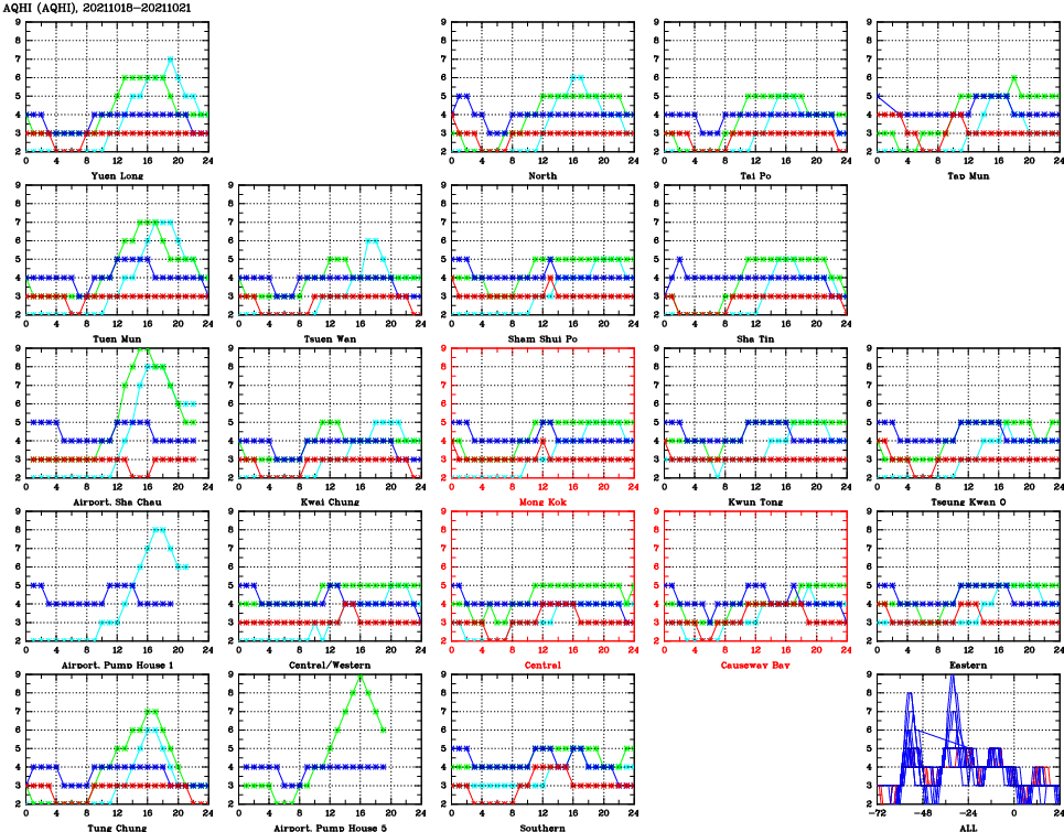 | Air Quality Data Time Series for AQHI (2021/10/21) | ( Line colors: Day -3 Day -2 Day -1 Current day ) | 2D Map Current AQHI |