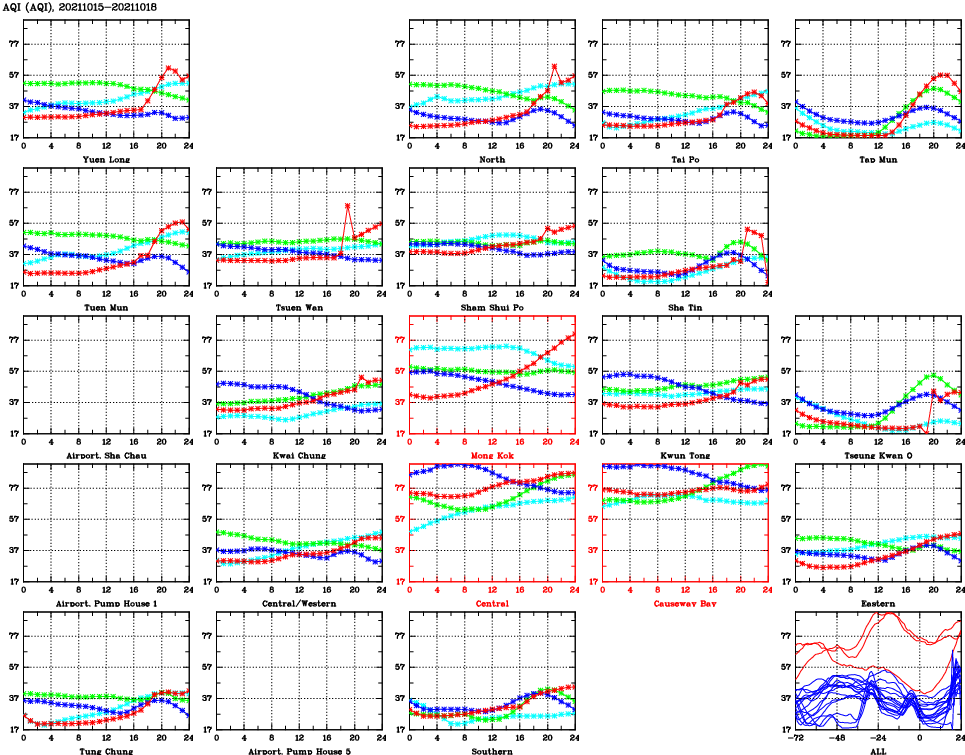| Air Quality Data Time Series for AQI (2021/10/18) | ( Line colors: Day -3 Day -2 Day -1 Current day ) | 2D Map Current AQHI |