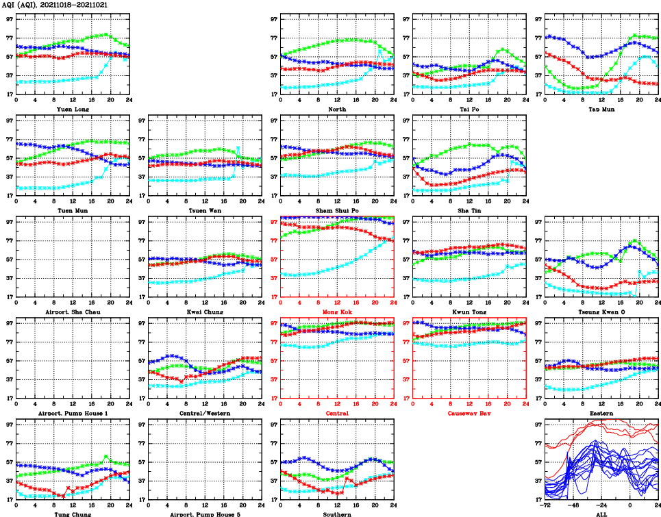 | Air Quality Data Time Series for AQI (2021/10/21) | ( Line colors: Day -3 Day -2 Day -1 Current day ) | 2D Map Current AQHI |
