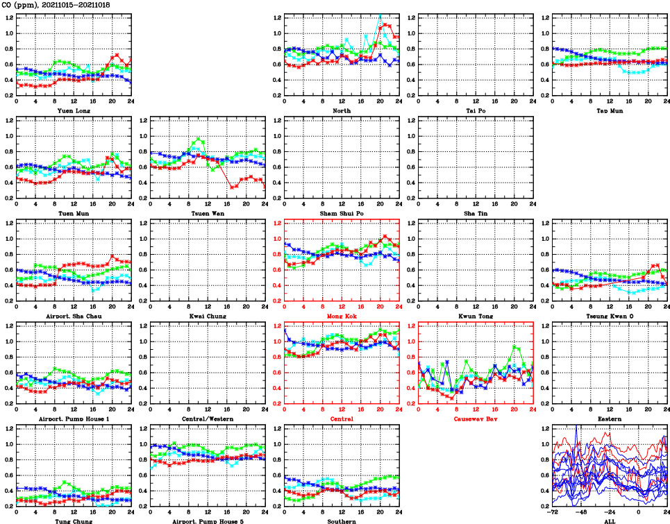 | Air Quality Data Time Series for CO (2021/10/18) | ( Line colors: Day -3 Day -2 Day -1 Current day ) | 2D Map Current AQHI |