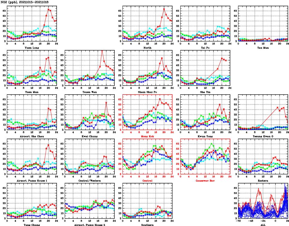 | Air Quality Data Time Series for NO2 (2021/10/18) | ( Line colors: Day -3 Day -2 Day -1 Current day ) | 2D Map Current AQHI |