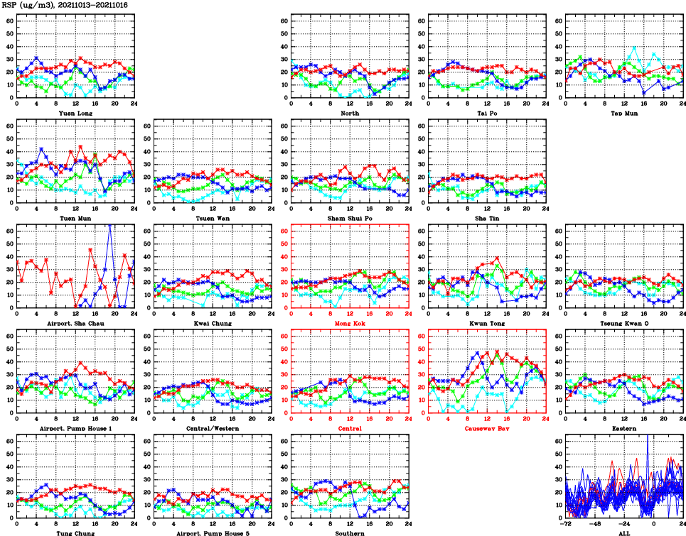 | Air Quality Data Time Series for RSP (2021/10/16) | ( Line colors: Day -3 Day -2 Day -1 Current day ) | 2D Map Current AQHI |