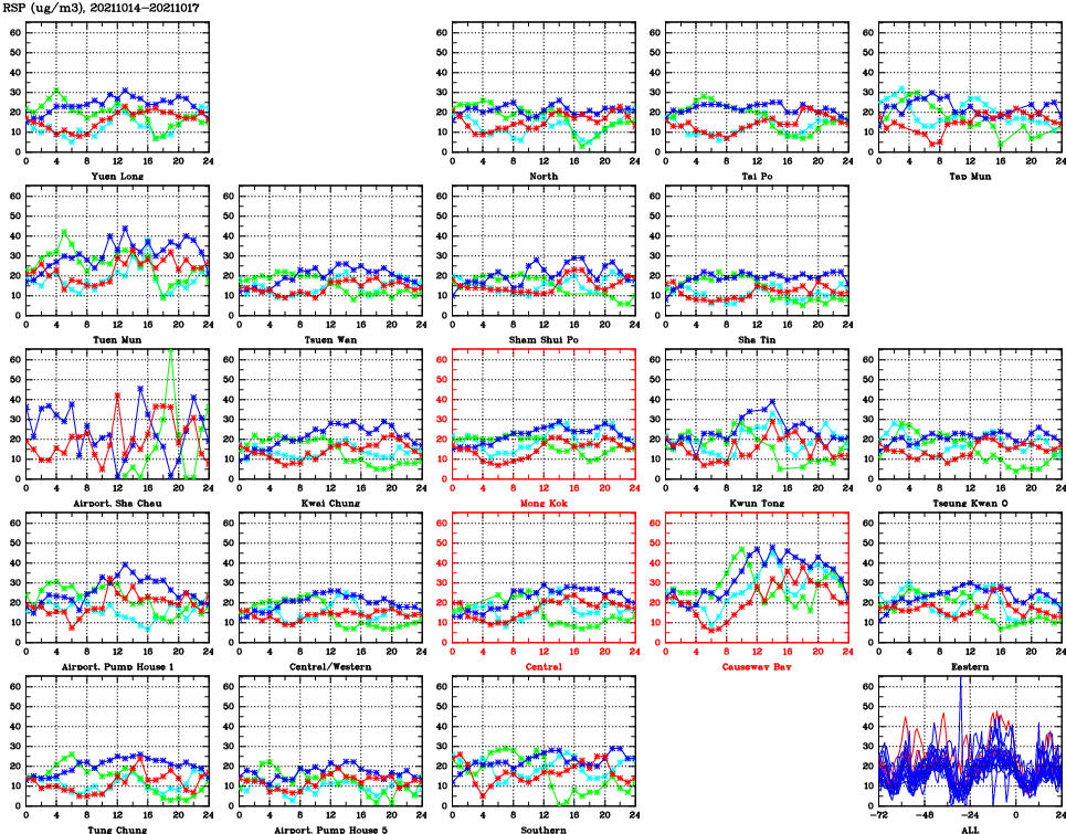 | Air Quality Data Time Series for RSP (2021/10/17) | ( Line colors: Day -3 Day -2 Day -1 Current day ) | 2D Map Current AQHI |