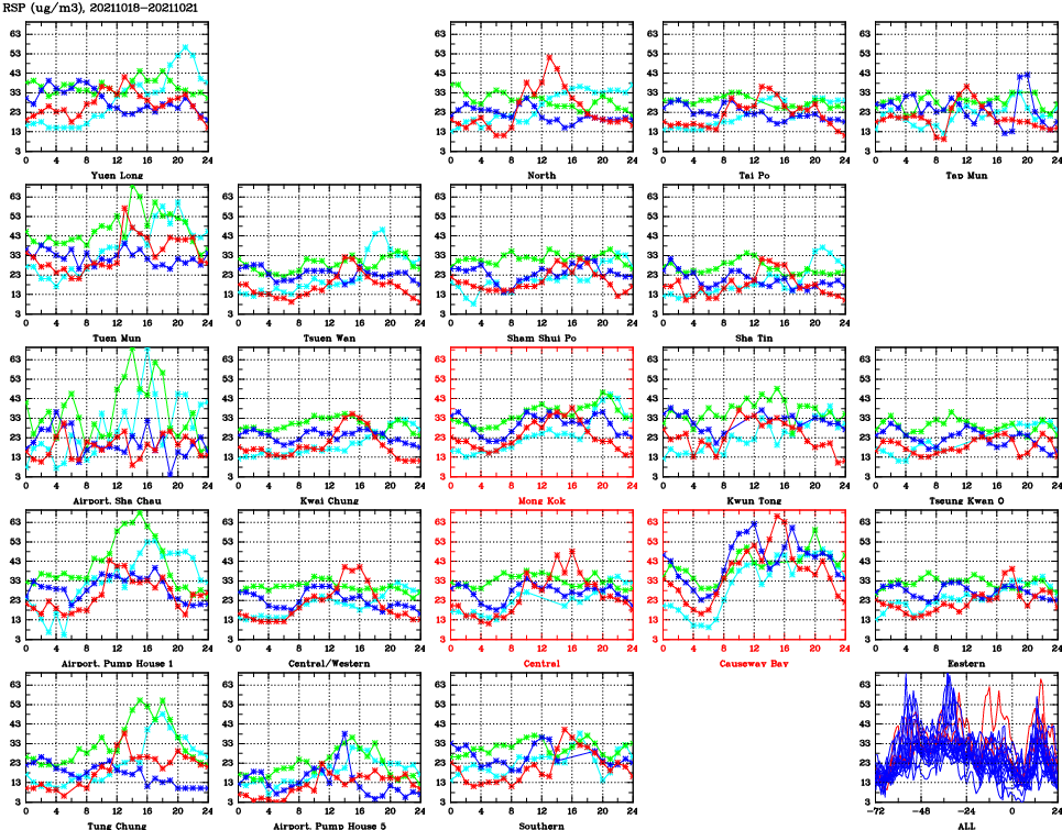 | Air Quality Data Time Series for RSP (2021/10/21) | ( Line colors: Day -3 Day -2 Day -1 Current day ) | 2D Map Current AQHI |