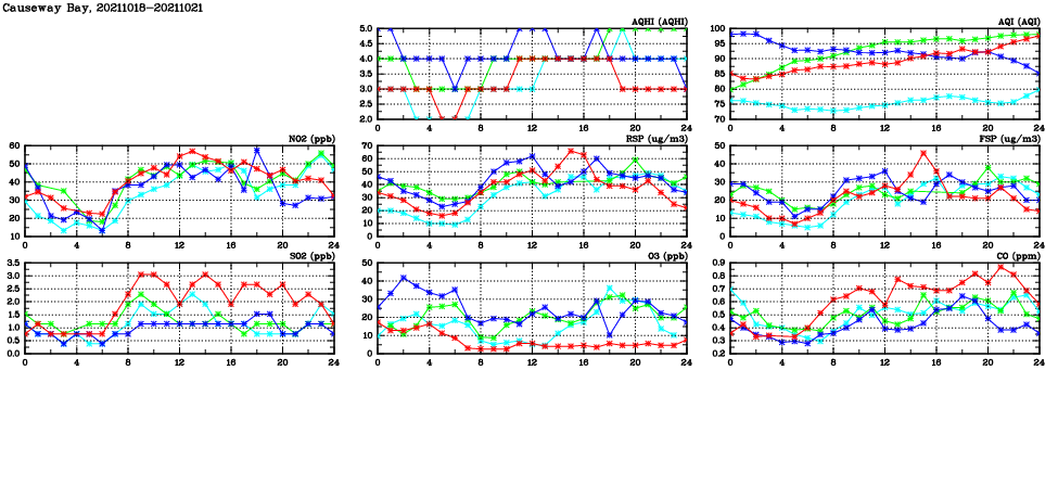 | Air Quality Data Time Series in Causeway Bay (2021/10/21) | ( Line colors: Day -3 Day -2 Day -1 Current day ) | 2D Map Current AQHI |