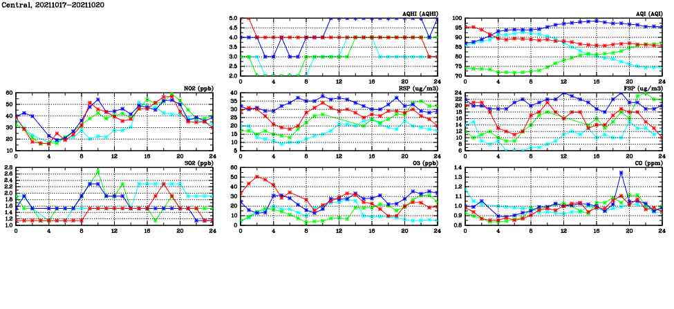 | Air Quality Data Time Series in Central (2021/10/20) | ( Line colors: Day -3 Day -2 Day -1 Current day ) | 2D Map Current AQHI |