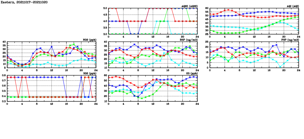 | Air Quality Data Time Series in Eastern (2021/10/20) | ( Line colors: Day -3 Day -2 Day -1 Current day ) | 2D Map Current AQHI |