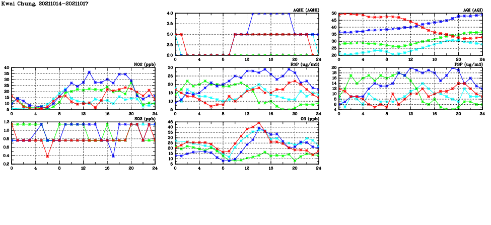 | Air Quality Data Time Series in Kwai Chung (2021/10/17) | ( Line colors: Day -3 Day -2 Day -1 Current day ) | 2D Map Current AQHI |