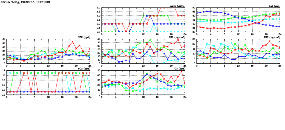 | Air Quality Data Time Series in Kwun Tong (2021/10/18) | ( Line colors: Day -3 Day -2 Day -1 Current day ) | 2D Map Current AQHI |