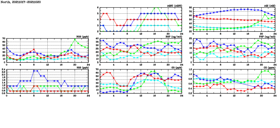 | Air Quality Data Time Series in North (2021/10/20) | ( Line colors: Day -3 Day -2 Day -1 Current day ) | 2D Map Current AQHI |