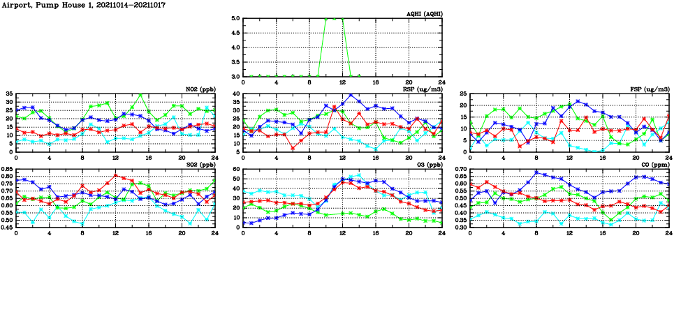 | Air Quality Data Time Series in Airport, Pump House 1 (2021/10/17) | ( Line colors: Day -3 Day -2 Day -1 Current day ) | 2D Map Current AQHI |