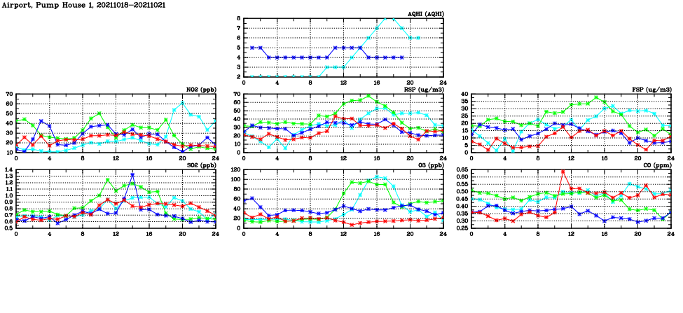 | Air Quality Data Time Series in Airport, Pump House 1 (2021/10/21) | ( Line colors: Day -3 Day -2 Day -1 Current day ) | 2D Map Current AQHI |