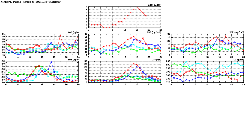 | Air Quality Data Time Series in Airport, Pump House 5 (2021/10/19) | ( Line colors: Day -3 Day -2 Day -1 Current day ) | 2D Map Current AQHI |