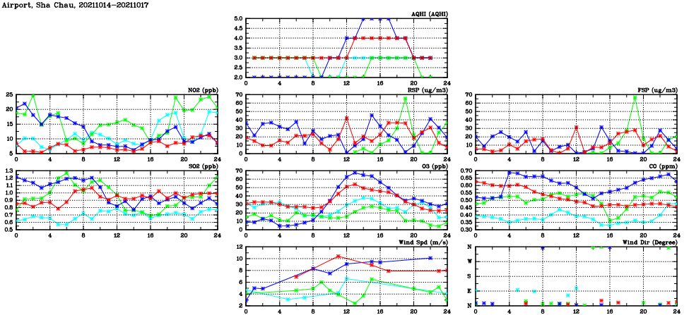 | Air Quality Data Time Series in Airport, Sha Chau (2021/10/17) | ( Line colors: Day -3 Day -2 Day -1 Current day ) | 2D Map Current AQHI |