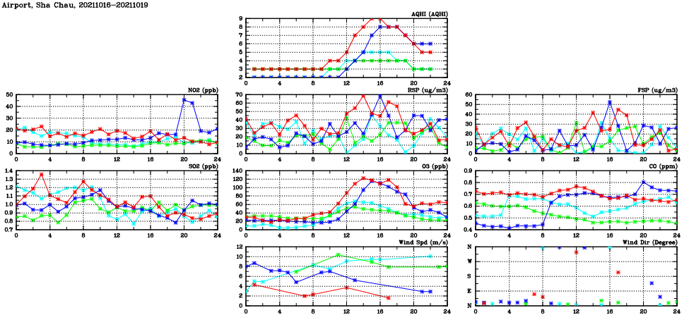 | Air Quality Data Time Series in Airport, Sha Chau (2021/10/19) | ( Line colors: Day -3 Day -2 Day -1 Current day ) | 2D Map Current AQHI |