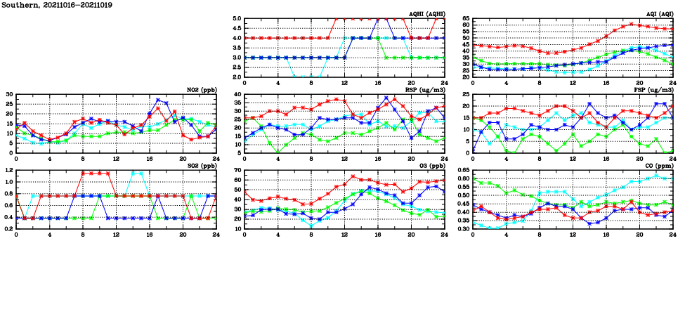 | Air Quality Data Time Series in Southern (2021/10/19) | ( Line colors: Day -3 Day -2 Day -1 Current day ) | 2D Map Current AQHI |