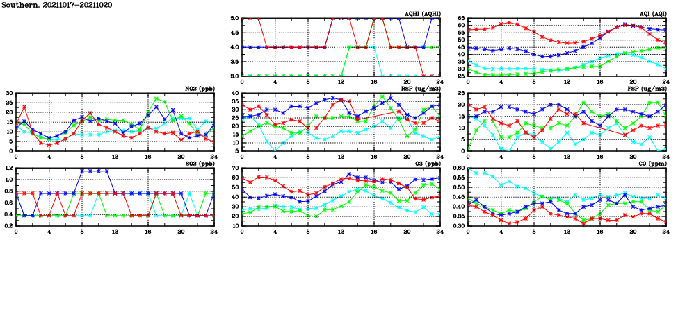 | Air Quality Data Time Series in Southern (2021/10/20) | ( Line colors: Day -3 Day -2 Day -1 Current day ) | 2D Map Current AQHI |