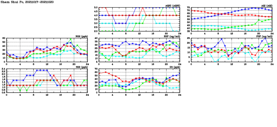 | Air Quality Data Time Series in Sham Shui Po (2021/10/20) | ( Line colors: Day -3 Day -2 Day -1 Current day ) | 2D Map Current AQHI |