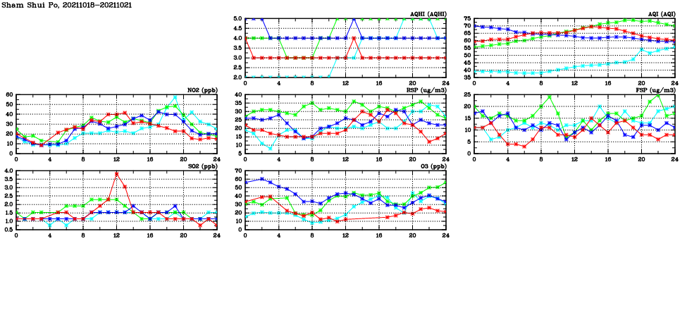 | Air Quality Data Time Series in Sham Shui Po (2021/10/21) | ( Line colors: Day -3 Day -2 Day -1 Current day ) | 2D Map Current AQHI |