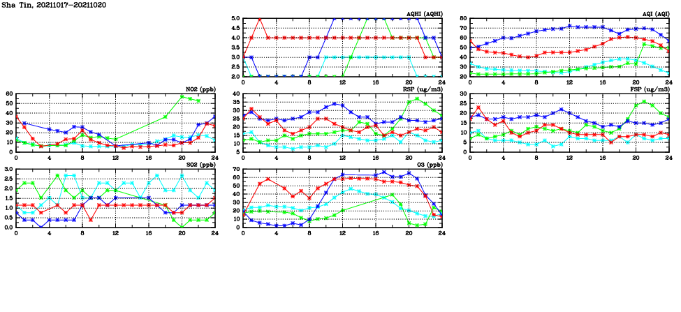 | Air Quality Data Time Series in Sha Tin (2021/10/20) | ( Line colors: Day -3 Day -2 Day -1 Current day ) | 2D Map Current AQHI |
