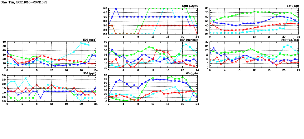 | Air Quality Data Time Series in Sha Tin (2021/10/21) | ( Line colors: Day -3 Day -2 Day -1 Current day ) | 2D Map Current AQHI |
