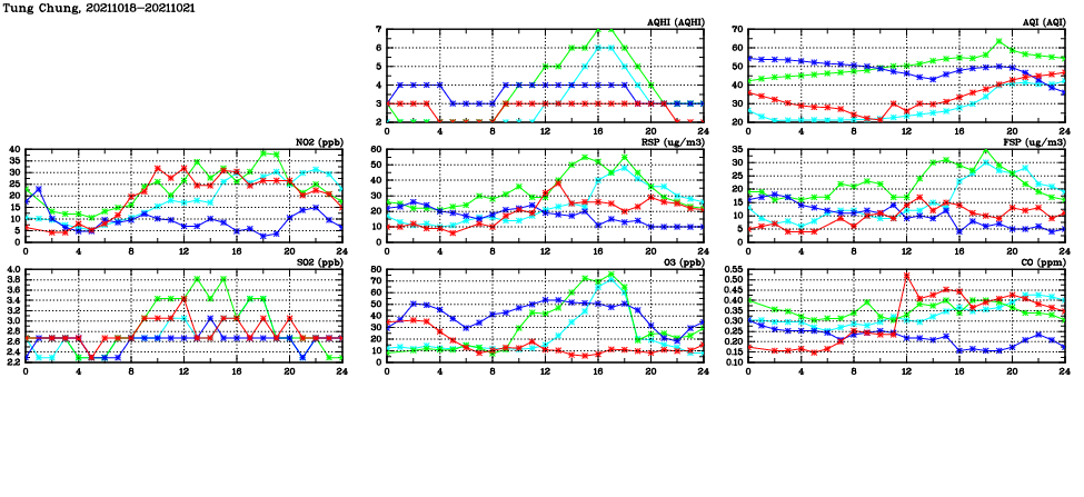 | Air Quality Data Time Series in Tung Chung (2021/10/21) | ( Line colors: Day -3 Day -2 Day -1 Current day ) | 2D Map Current AQHI |