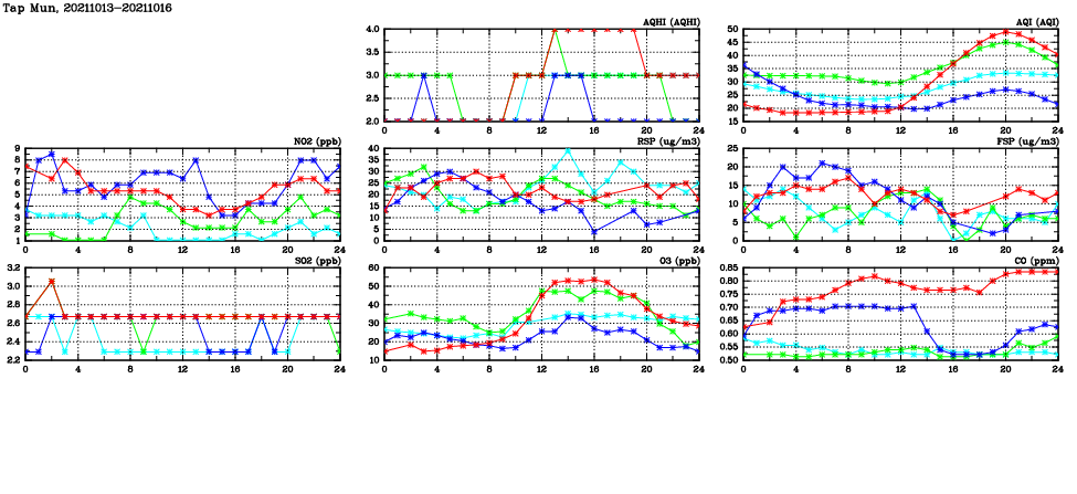 | Air Quality Data Time Series in Tap Mun (2021/10/16) | ( Line colors: Day -3 Day -2 Day -1 Current day ) | 2D Map Current AQHI |