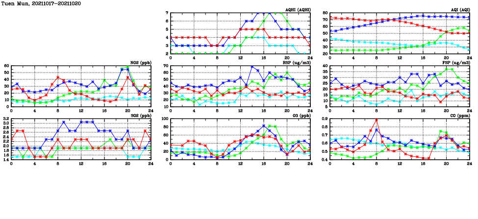 | Parameters: | AQHI | AQI | RSP | FSP | NO2 | SO2 | O3 | CO | Temp | WS | WD |