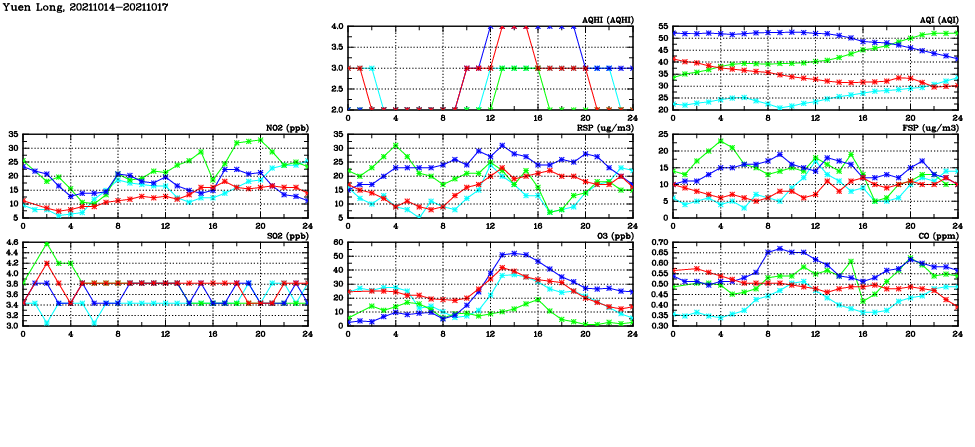 | Air Quality Data Time Series in Yuen Long (2021/10/17) | ( Line colors: Day -3 Day -2 Day -1 Current day ) | 2D Map Current AQHI |