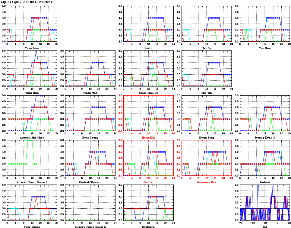 | Air Quality Data Time Series for AQHI (2021/10/17) | ( Line colors: Day -3 Day -2 Day -1 Current day ) | 2D Map Current AQHI |