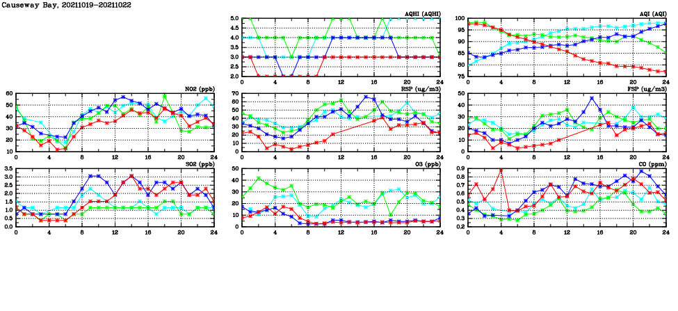| Air Quality Data Time Series in Causeway Bay (2021/10/22) | ( Line colors: Day -3 Day -2 Day -1 Current day ) | 2D Map Current AQHI |