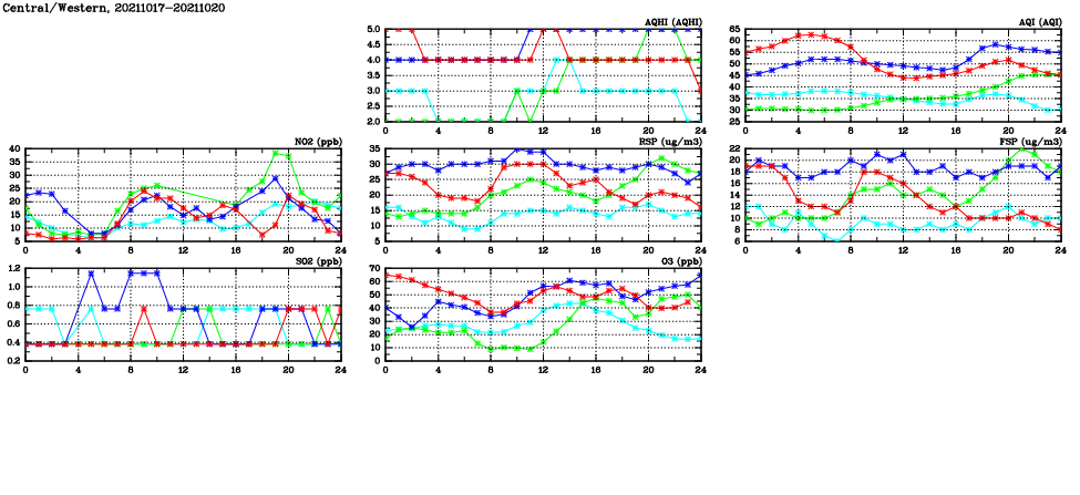 | Air Quality Data Time Series in Central/Western (2021/10/20) | ( Line colors: Day -3 Day -2 Day -1 Current day ) | 2D Map Current AQHI |
