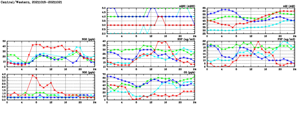 | Air Quality Data Time Series in Central/Western (2021/10/21) | ( Line colors: Day -3 Day -2 Day -1 Current day ) | 2D Map Current AQHI |