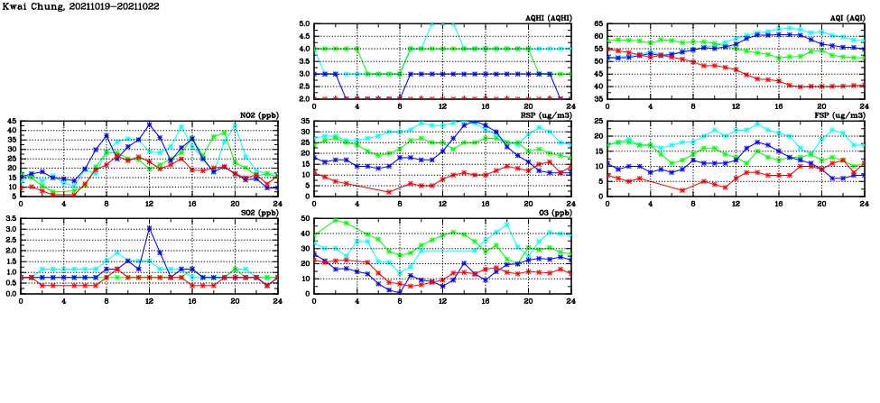 | Air Quality Data Time Series in Kwai Chung (2021/10/22) | ( Line colors: Day -3 Day -2 Day -1 Current day ) | 2D Map Current AQHI |