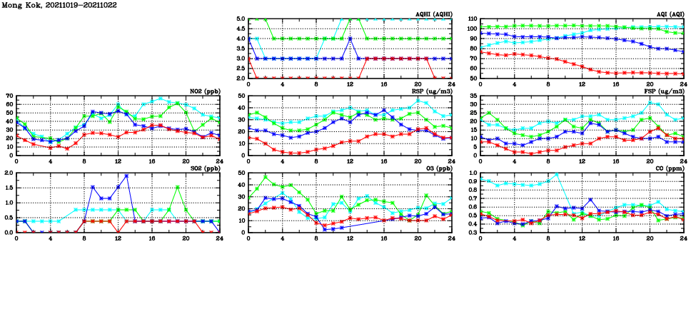 | Air Quality Data Time Series in Mong Kok (2021/10/22) | ( Line colors: Day -3 Day -2 Day -1 Current day ) | 2D Map Current AQHI |