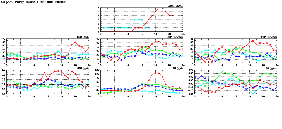 | Air Quality Data Time Series in Airport, Pump House 1 (2021/10/18) | ( Line colors: Day -3 Day -2 Day -1 Current day ) | 2D Map Current AQHI |